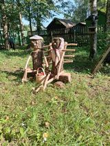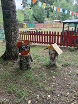 Здесь можно познакомить детей с обитателями леса в сказочной игровой форме. Сказочные зверюшки – медведь, заяц, олень и др. разместились на лесной опушке, в деревьях притаились птицы – дятел, ворон, сова, паук плетёт паутину, шустрые пчелы заполняют улей мёдом, а «Чудо-Юдо» охраняет муравейник. Сказочные жители Бабушка Матрена и дед Тимофей присели на отдых возле шалаша. Все сказочные фигуры изготовлены руками воспитателей и родителей, на основе небольших чураков, которые и были превращены в сказочных героев при помощи молотка, кусочков ткани, тесьмы, кожи, ниток, проволоки и других подручных материалов.